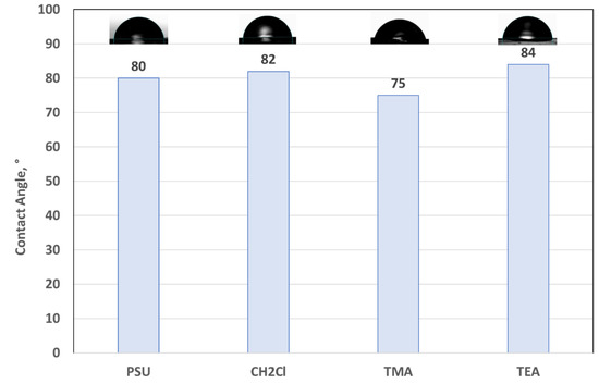 It is evident that the introduction of the chloromethyl group does not substantially change the surface properties of the membrane, causing only a slight increase in the contact angle due to the presence of the functional group [26]. The insertion of the trimethylamine reduces the contact angle value from 82° down to 75°, due to the pronounced hydrophilic property of the amine, while the insertion of TEA increases the value from 82° up to 84°, due to a less hydrophilic property of this group in respect to the TMA. The reported data are an average value of 5 measurements and can be considered as a trend.