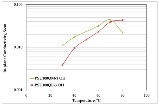 As expected, the increase in conductivity is proportional to the temperature. The maximum value of 44 mS/cm for PSU100QM-1, against 39.5 mS/cm of the PSU100QE-3 membrane, was reached at 70 °C. The sample PSU100QM-1 presented the highest values from 30 to 70 °C, and after this temperature a drop of conductivity was detected due to the swelling effect that causes a collapse of the mechanical properties. By contrast, the PSU100QE-3 sample, below 70 °C, had lower conductivity values than the PSU100QM-1, but steadily increased over the entire temperature range studied. This behavior can be justified by a lower swelling effect of the quaternary polymer with TEA, in accordance with the above-mentioned properties of wettability. In fact, the membrane that had a more hydrophilic behavior (PSU100QM-1) showed the highest swelling effect.