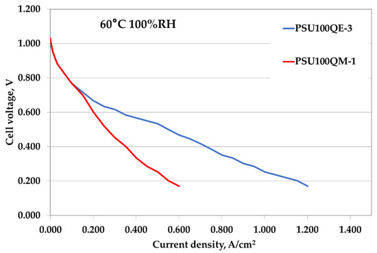 Polarization curves comparison of PSU-based membrane electrodes assemblies (MEAs).