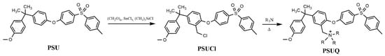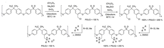 The quaternization derivatives (PSUQ) were obtained by treatment of chloromethylation derivative (PSUCl and PSUCl2) with an excess of trialkyl amine in dimethyl sulfoxide (DMSO) at 50 °C for 48 h.