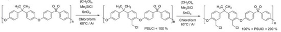 The chloromethylated PSU derivatives were synthesized from commercial PSU (Mn ~ 22,000) with paraformaldehyde in an equimolar amount of chlorotrimethylsilane (Me3SiCl) and stannic tetrachloride (SnCl4). The reaction was carried out in anhydrous chloroform under an N2 atmosphere and the mixture was refluxed at 60 °C for a variable time according to the desired derivatization percentage (Scheme 2).
