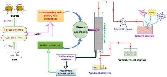 The environmental problems caused by textile printing and dyeing wastewater have become the focus of attention. Typical textile printing and dyeing wastewater usually contains dyes, polyvinyl alcohol (PVA), starch, and so on [1,2]. Some dyes may be further degraded into toxic and carcinogenic substances, which will affect human health [3]. The efficient and complete removal of dyes from effluents is necessary. Starch and PVA in textile printing and dyeing wastewater have a great influence on the reoxygenation behavior of bodies of water. As a result of the high chemical oxygen demand (COD) values and lower biodegradability, PVA is difficult to remove from textile wastewater by simple treatment facilities [4,5]. A lot of technologies, including flocculation, membrane separation, chemical oxidation, and degradation, have been studied for treating dye wastewater [6,7,8,9] or for treating PVA-containing wastewater [5,10,11,12,13], but so far, there have been no reports on the simultaneous removal of dyes, PVA, and starch from textile printing and dyeing wastewater. These methods also have many difficulties for industrial application, due to the high cost of investment and operation, complicated processes, and inability to remove pollutants completely [5,12,14]. By contrast, adsorption is one of the most efficient and reliable textile wastewater treatment techniques [15,16,17], and fixed-bed adsorption is often desired from an industrial point of view, because of its advantages of its 100% pollutant removal ability from wastewater, lower floor space, and lower cost of equipment investment and operation [18,19,20,21,22]. Many studies have been conducted on the dye adsorption properties of various adsorbents used in fixed beds, such as agricultural waste, chitosan-based materials, zeolites, and industrial by-products, etc. [18,23,24,25]; however, these adsorbents usually have defects with a low adsorption capacity. Up until now, activated carbon (AC), although its removal efficiencies for organic dyes are still relatively low [26,27], is still the most commonly used adsorbent for industrial wastewater treatment [28,29]. Therefore, in order to remove dye, polyvinyl alcohol, and starch from textile wastewater simultaneously, it is necessary to develop an efficient and low-cost fixed-bed adsorbent alternative.