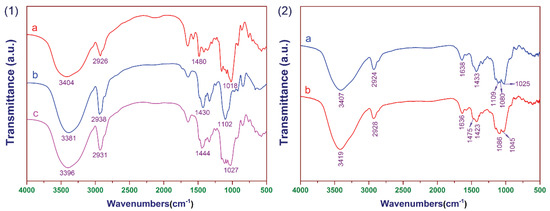 (1) The FT-IR spectra of (a) cross-linked cationic starch (CCS), (b) cross-linked cationic PVA (CCP), and (c) CCSP with a mass ratio of CS/CP of 1:1 (CCSP2). (2) The FT-IR spectra of the mixture adsorbent was composed of CCSP2 and activated carbon (AC), (a) before and (b) after treating the textile wastewater.
