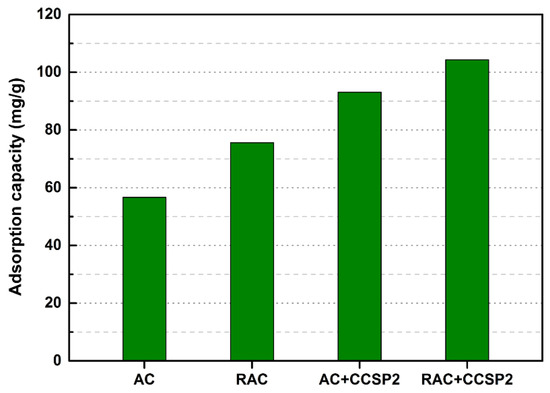 After adsorption, the disabled mixture adsorbent was recycled as follows. First, the disabled adsorbent was dried at 110 °C for 12 h under an air atmosphere, and then carbonized at 350 °C for 3 h under an N2 atmosphere. Next, the carbon spheres were impregnated with the activating agent KOH [43], and the activation process was carried out at 850 °C for 2 h under an N2 atmosphere. The obtained material, signed as regenerated activated carbon (RAC), was washed with diluted HCl and deionized water separately, and finally dried.