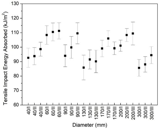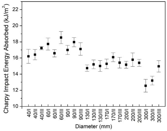 There are several types of polyamide 6 available on the market. Most of the studies in the literature relate to sodium-catalyzed cast and extruded polyamide 6. The values of their Charpy’s impact strength are under 10 kJ/m2 based on product catalogues for pure, notched sodium-catalyzed polyamide 6 samples according to the EN ISO 179-1/1eA standard [29]. The Charpy notched impact energy absorbed of the all samples at each investigated diameter with different zones (I, II and III) of the rods is shown in Figure 2. The average Charpy’s impact strength, which is expressed as mean values of 105 independent replicates, in the investigated size range was 15.9 kJ/m2 and its percent standard deviation was 10.5%. Thus, the magnesium-catalyzed polyamide 6 had a relatively higher Charpy’s impact strength than the sodium-catalyzed polyamide 6 had. Based on the Charpy’s test results (Figure 2.), it was concluded that the impact strength values were not permanent in the investigated rod diameter range. Moreover, they could be grouped into three categories, which was confirmed in Section 3.3. by the Dunnett’s test. To the first category, the rods with a diameter from 40 to 90 mm belonged here and their impact strength were between 16.2 and 18.5 kJ/m2. It was higher than the average. Second category, including the 130, 170 and 200 mm diameter rod, had a range of impact strength between 14.7 and 16 kJ/m2. The rod, which had a 300 mm diameter, fell into third category because its impact toughness was below the average, ranging between 12.5 and 15 kJ/m2. All data are mean values of at least five repetitions. It is indicated that the reduction of impact strength was able to reach 23%, it means 4 kJ/m2, if the rod with a 60 mm diameter was compared to a 300 mm diameter. From the point of view of the engineering application, the results suggest that the original size of semi-finished rods could influence the toughness behavior of parts.