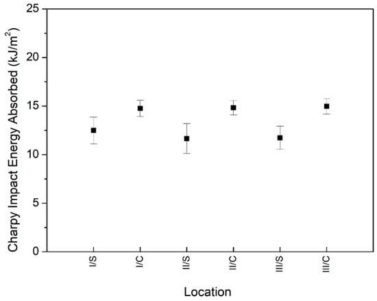 The results of detailed larger rod test have proven that the toughness of the skin and the core zone show significant dissimilarities, which is proved in detail in Section 3.3. by Welch’s t-test. The lowest and highest Charpy impact strength were measured at the samples machined from the 300 mm diameter skin zone II and core zone III, respectively. The change was 23% expressing 3 kJ/m2.
