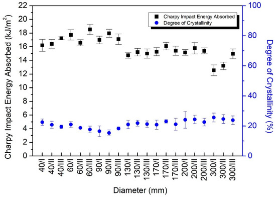 Based on the DSC results in Figure 7, it was concluded that the change in the degree of crystallinity affects the Charpy impact strength. Accordingly, the higher degree of crystallinity is able to cause the reduction of the toughness. Earlier studies have found the same [22,23]. This phenomenon can be definitely observed at the larger rods than 60 mm diameter. Furthermore, it was determined that the degree of crystallinity, from among the factors that influence the properties of polyamide, affected 62.3% of the variation of Charpy impact strength, which was proved in Section 3.4. by linear regression. Consequently, the other factor, i.e., the ratio of the amide and methylene group, the crystal morphology and the residual monomer etc. were responsible for 37.8% of the variation of Charpy impact toughness.