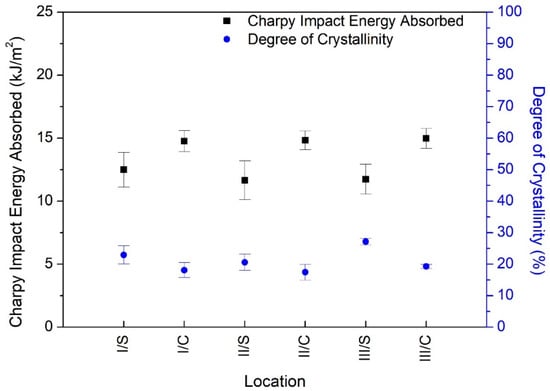 The detailed study of 300 mm diameter rod is reported in Figure 8, where S and C mean the skin and core zone, respectively. The degree of crystallinity was between 17% and 27% depending on the location of the sample taken along the cross-section. This 10% of variation in the degree of crystallinity may cause the difference in Charpy’s impact strength between the skin and the core zone. This data suggest that the Charpy’s impact strength decreased significantly with the increasing degree of crystallinity. It indicates that high crystallinity content was not necessarily advantageous for the impact strength in a 300 mm diameter or more region of magnesium-catalyzed semi-finished rods.