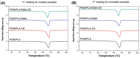 First heating and cooling for (A) PLA- and (B) POM-based blends.