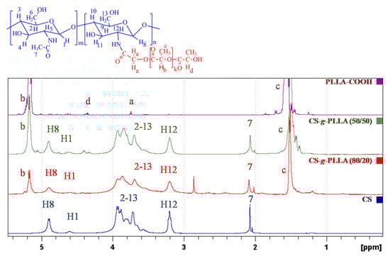1H NMR and FTIR spectroscopies were employed to characterize the synthesized copolymers. Figure 1 shows the 1H NMR spectra of the CS-g-PLLA(80/20) and CS-g-PLLA(50/50) copolymers and the precursor homopolymers CS and PLLA-COOH. The 1H NMR spectrum of CS shows multiple peaks between 3.58–3.94 ppm attributed to H2-H6, H9-H11 and H13 and four peaks at 2.09 ppm (H7), 3.22 ppm (H12), 4.63 ppm (H1) and 4.91 ppm (H8), characteristic of the protons of the sugar moieties [23]. The successful grafting of PLLA onto the CS backbone was confirmed by the presence of the methyl and methine peaks of PLLA, at 1.54 ppm (Hc) and 5.17 ppm (Hb), respectively, in the 1H NMR spectra of CS-g-PLLA(80/20) and CS-g-PLLA(50/50). By ratioing the integrals of the peaks attributed to the (Hc) protons of PLLA at 1.54 ppm, to the methyl protons of the acetylated (H7) CS at 2.09 ppm, the grafting density of PLLA was found to be one PLLA chain per 227 CS repeat units, which corresponds to a 18 wt % PLLA, for CS-g-PLLA(80/20), and one PLLA chain per 62 monomer repeat units of CS, corresponding to about 45 wt % PLLA, for CS-g-PLLA(50/50). From the above results, it is revealed that for both CS-g-PLLA copolymers about 90% of the PLLA chains from the reaction feed were grafted along the CS backbone.