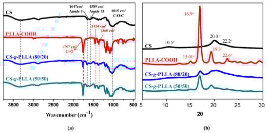 The ATR-FTIR spectra for both graft copolymers exhibited the characteristic bands of PLLA and CS verifying the successful grafting of the PLLA chain onto the CS backbone (Figure 2a). In particular, the spectra of CS-g-PLLA(80/20) and CS-g-PLLA(50/50) showed the carbonyl (C=O) band of the ester group at 1757 cm−1, the characteristic C–O–C band at 1015 cm−1, the C–H band of the methyl groups at 1454 cm−1 and the C-H bending vibration of the methine groups at 1360 cm−1 were attributed to the PLLA chains. Moreover, they showed two characteristic peaks at 1647 and 1589 cm−1, assigned to the amide I and amide II bonds of CS, respectively [40,41]. An increase in the relative intensity of the carbonyl band at 1757 cm−1, due to the PLLA ester groups, compared to the amide I band of CS at 1647 cm−1, was observed for CS-g-PLLA(50/50), indicating the higher PLLA content of the copolymer.