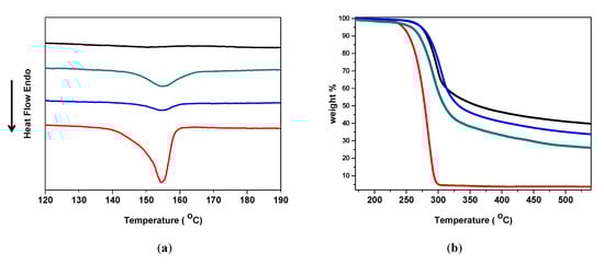 The thermal properties of PLLA-COOH, CS and the two graft copolymers were investigated by DSC measurements (Figure 3a). The thermogram of the PLLA-COOH homopolymer showed a melting temperature of 154 °C, while CS did not exhibit any transition in the temperature range examined. Upon grafting the PLLA-COOH chains onto the CS backbone, the melting temperature of the PLLA segments remained at 155 °C for both graft copolymers, however, the peak intensity decreased, suggesting that the crystallinity of the PLLA segments was significantly suppressed. The degree of crystallinity of the PLLA-COOH homopolymer and the graft copolymers was calculated from the enthalpy of fusion (ΔHf). For the PLLA-COOH homopolymer, the ΔHf was found to be 62.1 J/g, which corresponds to a crystallinity (Xc) of 66% (the ΔHf for 100% crystalline PLLA is 93.6 J/g) [41]. After grafting the PLLA chains onto the CS backbone, the crystallinity of PLLA reduced to 57 % for CS-g-PLLA(50/50) (ΔHf = 53.8 J/s) and 47% for CS-g-PLLA(80/20), (ΔHf = 44.2 J/s) (Table 1). These results reveal a reduction in the crystallinity of the grafted PLLA chains, which decreases with the decrease in the PLLA content of the copolymer and is in good agreement with the XRD measurements discussed above.