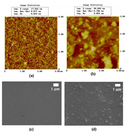 (a,b) AFM and (c,d) SEM images of CS-g-PLLA(80/20) (a,c) and CS-g-PLLA(50/50) (b,d).