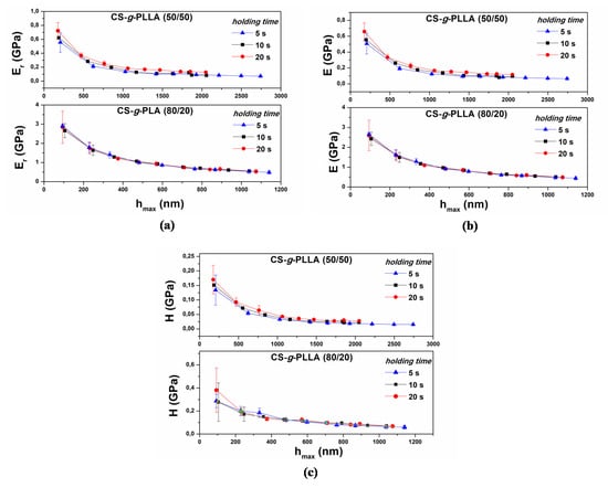 (a) Reduced modulus (Er), (b) Young’s modulus (E) and (c) hardness (H) values for the CS-g-PLLA copolymers as a function of maximum indentation depth, for 5, 10 and 20 s holding times.