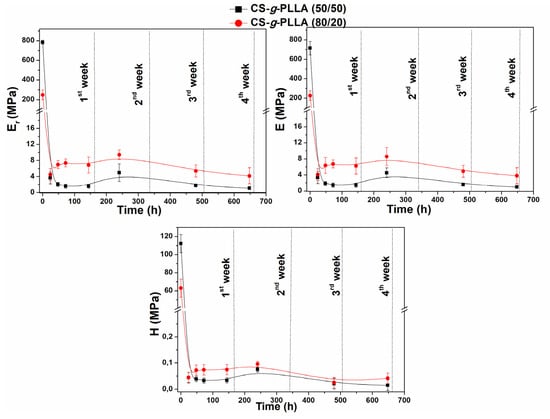 Following the nanoindentation tests performed on the dried discs, the samples were immersed in α-MEM medium at 25 °C under static conditions, for a period of 4 weeks, and their nanomechanical properties were evaluated at certain time periods. Due to the hydrophilic nature of CS, the copolymer with the higher CS content, was highly deformed after the 4 week immersion in the medium, whereas the CS-g-PLLA(50/50) sample became swollen and fractured for the same time period. Figure 6 shows the reduced modulus, Young’s modulus and hardness values, calculated by the Oliver and Pharr method, for both CS-g-PLLA samples as a function of immersion time. As seen in the figure, for both CS-g-PLLA samples, the Er, E and H values decreased rapidly during the first 24 h of submersion in the medium, due to the water uptake by the samples (Table 3).