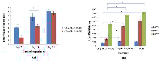 The percentage of mass loss of the two graft copolymers, CS-g-PLLA(80/20) and CS-g-PLLA(50/50), following immersion of the copolymer discs in PBS for 7, 14 and 21 days, was determined (Figure 7a). The weight loss was higher for the graft copolymer with the higher CS content for the first two weeks. Specifically, the mass loss for the CS-g-PLLA(80/20) discs was ~ 4, 7 and 8 wt % at days 7, 14 and 21, respectively, whereas the corresponding values for the CS-g-PLLA(50/50) sample were ~2, 4 and 8 wt %. A similar behavior has been reported in the literature, and was attributed to the higher content of the material in hydrophilic CS, which provided better accessibility to water, thus enhancing its hydrolytic degradation [53].
