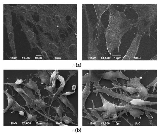 Characteristic SEM images illustrating the morphology of the MC3T3-E1 pre-osteoblastic cells cultured for 2 days on (a) CS-g-PLLA(80/20) and (b) CS-g-PLLA(50/50) films.