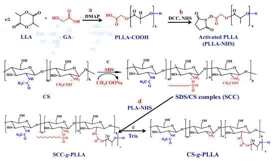 Schematic representation of the synthetic procedure followed for the preparation of the CS-g-PLLA copolymers: (a) ring-opening polymerization of LLA; (b) activation of PLLA-COOH; (c) formation of the organo-soluble SCC complex; (d) grafting of PLLA-NHS onto the SCC backbone; (e) elimination of SDS.