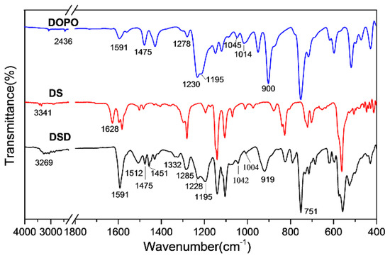The FTIR spectra of DOPO and DSD are shown in Figure 1. In the FTIR spectra of DOPO, the absorption peak at 2436 cm−1 was assigned to the stretching vibration of P–H. The peaks at 1591 and 1475 cm−1 were attributed to the stretching vibrations of P–CAr, and stretching vibration peaks of 1278 and 1230 cm−1 (P=O), 1045 and 1014 cm –1 (P–O–C), and 1195 and 900 cm−1 (P–O–CAr) could be observed. As for DS FTIR spectra, the peak at 1628 cm−1 could be attributed to the stretching vibrations of C=N, suggesting that DS was synthesized successfully. In the FTIR spectra of DSD, the absorption peaks were detected at 3269 and 1512 cm−1 (N–H), 1332 cm−1 (C–N), 1591 and 1475 cm−1 (P–CAr), 1285 and 1228 cm−1 (P=O), 1042 and 1004 cm−1 (P–O–C), and 1195 and 919 cm−1 (P–O–CAr). In addition, the peak of P–H, which was observed at 2436 cm−1 in DOPO, was not detected in the spectrum of DSD. This phenomenon means that the –P–H bond in the molecule of DOPO completely participated in the additive reaction with the –C=N– bond in DS.