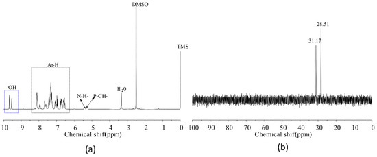 1H-NMR and 31P-NMR were conducted on a Bruker Avance spectrometer (400 MHz) at room temperature, using DMSO-d6 as the solvent. 1H-NMR (DMSO-d6, δ, ppm): 5.22–5.32 (2 H, P–C–H); 5.37–5.48 (2 H, –NH–); 6.44–8.30 (16 H, Ar–H); 9.48–9.73 (2 H, –OH).