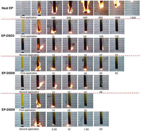 The combustion of neat EP and EP–DSD thermosets during the UL-94 test was recorded by a digital camera. The relevant screenshots are shown in Figure 3. Obviously, the neat EP combusted vigorously with flaming drips after the first ignition, which showed that it was highly flammable. In regard to EP–DSD thermosets, the combustion behaviors differed from those of neat EP, and they all extinguished spontaneously. With the increasing of the DSD content, the burning times after the first and second ignition decreased gradually. Moreover, the pyrolytic gases were found to be continuously ejected from the interiors of samples during combustion, and this ejection of gas could even blow the flame out at times. Some studies have also reported this phenomenon, called “blowing-out”, which helps to reduce the combustion time and improve the flame-retardancy of thermosets [32].