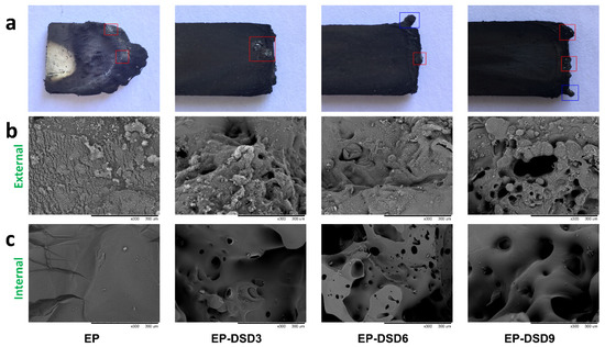 As presented in Figure 4a, neat EP possessed a loose and cotton-like char layer with distinct cracks after the UL-94 test. Unlike neat EP, the residual char of EP–DSD thermosets maintained a cuboid morphology, which the UL-94 test required for samples, and the char layer of EP–DSD thermosets was relatively tight and smooth. Furthermore, for EP–DSD thermosets, it should be noted that there were several raised stomates marked with the blue box on the surface of residual char, where pyrolytic gases were found to be ejected during the UL-94 test. It is possible that the loading of DSD enhanced the strength of the char layer, and the strength was strong enough to maintain the shape of raised stomates due to the high internal pressure caused by the accumulation of pyrolytic gases during combustion.