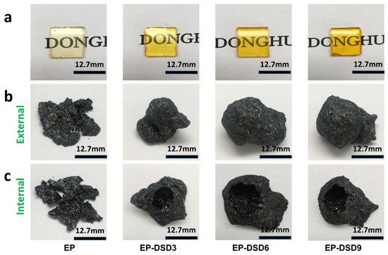 As shown in Figure 5b,c, the neat EP presented a fragile and lamellar char layer, while EP–DSD thermosets showed an intumescent and three-dimensional structural morphology. The surface char layers were carefully cut open by a razor blade, showing that the interior of residual chars for EP–DSD thermosets was hollow and presented a huge cavity, which could gather a certain amount of pyrolytic gases. This indicates that the loading of DSD could enhance the char layer cohesion, which acted like a more efficient physical barrier to pyrolysis gas mass transfer. When heated, with the increasing amount of pyrolytic gases generated and accumulated under the char layer, an intumescent morphology with a porous structure inside was finally exhibited.