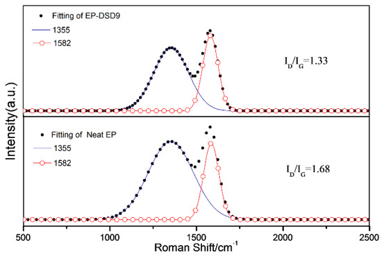For further investigation, the residual chars for neat EP and EP–DSD9 thermosets after thermal degradation under nitrogen atmosphere were examined by laser Raman spectroscopy. The corresponding Raman spectra of residue char are presented in Figure 6. Both of the two spectra displayed two peaks at 1355 cm−1 (D band) and 1582 cm−1 (G band). Generally, the D band corresponds to carbons in a disorder arrangement, while the G band relates to carbons in graphite layers [9,36,37]. The intensity of D and G bands was represented by the relevant peak area, and the ratio of the intensity of D and G bands (ID/IG) of neat EP and EP–DSD9 thermosets was calculated by the ratio of peat areas. As shown in Figure 6, the ID/IG values of neat EP and EP–DSD9 thermosets were 1.68 and 1.33, respectively. This means that the residual char of EP–DSD9 thermosets possessed a higher graphitization degree, and thus had a higher heat stability.