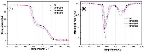 As Figure 7 shows, there were two rapid descents in the TG curve, which corresponded to the two peaks in the DTG curve. These indicated that there were two weight-loss processes in the thermal degradation of all EP thermosets under air atmosphere. However, it was clear that the TG and DTG curves of EP–DSD thermosets were different from those of neat EP. Although the loading of DSD did not change the two-stage thermal degradation of EP thermosets under air atmosphere, it advanced the decomposition time. As shown in Table 3, compared with neat EP, the loading of DSD resulted in a lower T5% for EP/DSD thermosets, and it decreased from 369.7 °C for neat EP to 346.4 °C for EP–DSD9. Besides, with the increasing of DSD content, higher char yields at Tmax and 700 °C could be observed when compared with neat EP. This suggests that the introduction of DSD could reduce the weight loss and promote the formation of char residues, and hence improve the thermal stability.