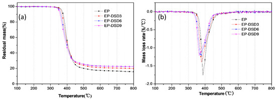 Figure 5a presents digital photos of neat EP and EP–DSD thermosets, and all EP thermosets exhibited a transparent appearance. As a part of the curing agent, DSD could participate in the curing action with DGEBA and DDM. After curing, EP–DSD thermosets could be considered as whole in the chemical structure. Unlike some inorganic materials, such as montmorillonite (MMT) and nanofillers, DSD is not dispersed in EP, so the presence of stacks and phase separation can be avoided in EP–DSD thermosets [11,34]. He et al. have reported a flame-retardant EP/MMT composite with an opaque and dark brown appearance, which resulted from the visible MMT particles in the EP composite [33]. In addition, when heated to melting in the preparation of EP–DSD composites, the mixture of DDM, DSD, and DGEBA also presented a transparent liquid. It could be deduced that the absence of stacks derived from completely participating in the curing action and good compatibility with the EP matrix, resulting in the transparent appearance of EP–DSD thermosets [35].