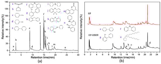 Pyrograms of DSD (a), and neat EP and EP–DSD (b) thermosets.