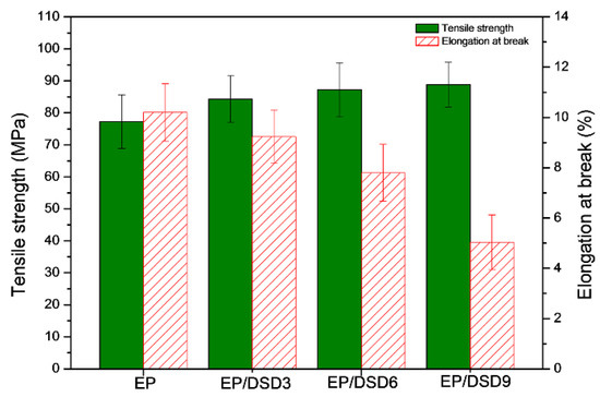 When used as a curing agent, the influence of DSD on tensile properties was investigated by measurement of the tensile strength and elongation. The results are exhibited in Figure 10. Neat EP displayed outstanding tensile properties, with a tensile strength of 77.29 MPa and elongation of 8.39% at breaking point. The addition of DSD improved the tensile strength of EP–DSD composites from 84.37 MPa for EP–DSD3 to 88.83 MPa for EP–DSD9. Cross-linking degree values were calculated and are listed in Table 5. They increased from 1958 mol/m3 for neat EP to 2105 mol/m3 for EP–DSD9, and thus raised the Tg from 171.2 to 176.5 °C, complying with the increasing of tensile strength. This could be attributed to the larger cross-linked network structure, which was formed by the cross-linking of OH and –NH– groups in DSD with DGEBA and DDM. However, the cross-linked network structure and the rigid DOPO group constrained the molecular chain motion [39], and the elongation of EP–DSD thermosets decreased with the increasing dosage of DSD.
