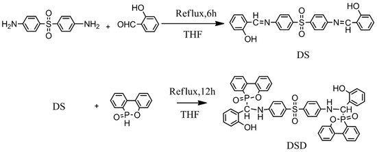 Synthetic routes of the intermediate imine (DS) and a 9,10-dihydro-9-oxa-10-phosphaphenanthrene-10-oxide (DOPO)-based flame retardant (DSD).