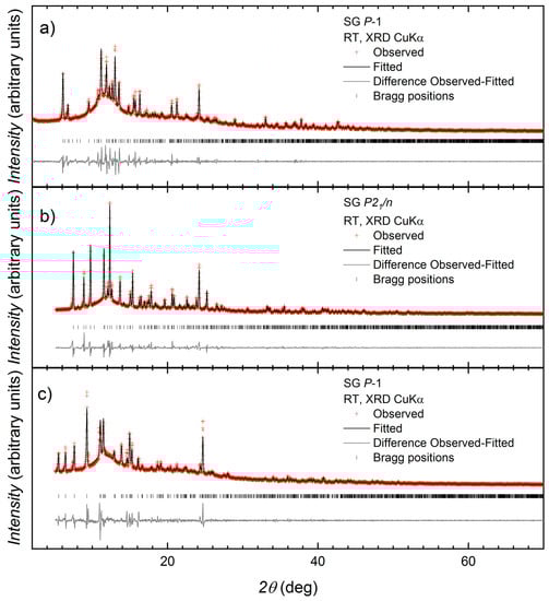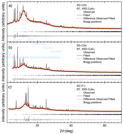 - Pawley, G.S. Unit-cell refinement from powder diffraction scans. J. Appl. Cryst. 1981, 14, 357–361. [Google Scholar] [CrossRef]