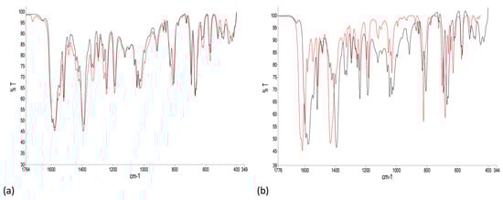 Normalized FT-IR spectra (solid-state) of the bulk materials from (a) experiment 1 (black line) and experiment 2 (red line), and (b) experiment 1 (black line, [{Cu4(μ3-OH)2(μ-OAc)2(μ3-OAc)2(AcO-κO)2(1)2}·2MeOH]n) and the preparative scale reaction (red line, [Cu2(μ-OAc)4(1)]n). Full spectra are given in Figure S9.