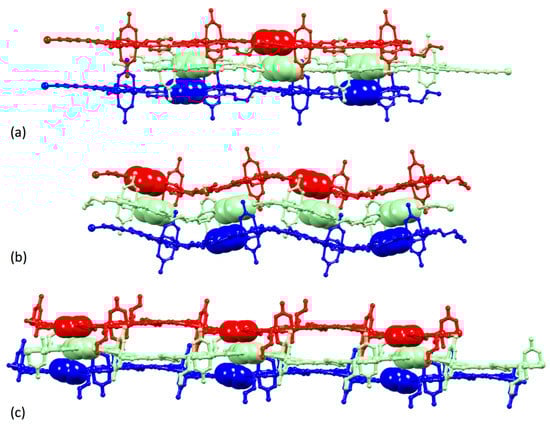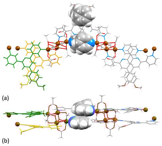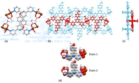 In the double-stranded chain, ligands 1 in adjacent strands lie over one another, but in an offset manner. This is illustrated in Figure 9a with green and orange coding. Pairs of 4-methoxyphenyl units engage in π-stacking with a centroid…centroid separation of 3.99 Å and an angle between the ring-planes of 8.7°. In the 3,2′:6′,3″-tpy unit, only the ring containing N2 is involved in face-to-face π-stacking; pyridine rings containing N2 and N2i (symmetry code i = 1–x, y, 3/2–z) stack with a centroid…centroid distance of 3.69 Å and an angle between the ring-planes of 9.7° (Figure 9a,b). π-Stacking interactions also occur between polymer chains to give extended interactions through the lattice (Figure S12 in Supplementary Materials).