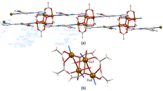 Changes to the crystallization and work-up conditions (see Materials and Method section and Section 3.2) resulted in the growth of blue crystals of {[Cu4(μ3-OH)2(μ-OAc)2(μ3-OAc)2(AcO-κO)2(1)2]·2MeOH}n. This 1D coordination polymer crystallizes in the monoclinic space group C2/c and consists of ligands 1 (in conformation 2 in Scheme 2) linked by tetranuclear copper clusters. The asymmetric unit is depicted in Figure S11 and contains one independent ligand 1 and half of a copper cluster; the second half is generated by inversion. Consequently, the polymer is double-stranded, as shown in Figure 8a. The cluster (Figure 8b) comprises a planar array of four Cu atoms with Cu…Cu edge lengths of 3.3770(6) and 3.0822(7) Å. Two μ3-OH ligands (Cu–O = 1.9429(17), 1.9942(18)Å) support the rhombus (Figure 8b) and the Cu…Cu separation for the unique doubly bridged unit is 2.9863(7) Å. The hydroxido H atom was directly located (O–H = 0.841(18) Å). The edges of the Cu4 unit are bridged by two μ-acetato (Cu–O = 1.9406(19), 2.186(2) Å) and two μ3-acetato (Cu–O = 1.9879(19), 2.453(2), 2.688(2) Å) ligands; for the bridging descriptors, we consider the long Cu–O length of 2.688(2) Å to be a bonding interaction. Atom Cu2 is further coordinated by a monodentate acetato ligand (Cu–O = 1.965(2) Å). The coordination numbers of Cu1 and Cu2 are, therefore, six and five, respectively. A search of the CSD (v. 5.41 []) for copper clusters containing a {Cu4(μ3-OH)2(μ-OAc)2} with the same geometry as that in {[Cu4(μ3-OH)2(μ-OAc)2(μ3-OAc)2(AcO-κO)2(1)2]·2MeOH}n revealed 75 hits, but none identical to that shown in Figure 8b. Examples of closely related clusters include those with CSD refcodes IWAHAP [], MAFBUR [], DUYWOL [] and QAWHUS [].