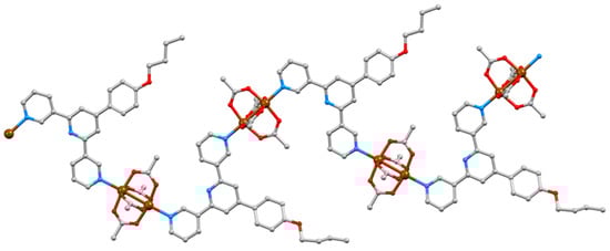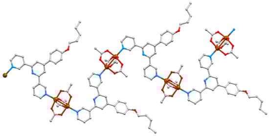 The 1D coordination polymer chains in [2{Cu2(μ-OAc)4(2)}·1.25MeOH]n, [{Cu2(μ-OAc)4(4)}·0.2CHCl3]n and [Cu2(μ-OAc)4(3)]n are displayed in Figure 11, Figure 12 and Figure 13, respectively. In each, the 3,2′:6′,3″-tpy domain exhibits conformation 2 (Scheme 2) in contrast to conformation 1 (Scheme 2) observed in [Cu2(μ-OAc)4(1)]n. However, a comparison of Figure 11, Figure 12 and Figure 13 reveals a further distinction between the coordination modes. In ligand-conformation 2, the outer nitrogen lone pairs point in or out with respect to the cavity defined by the central pyridine ring of the 3,2′:6′,3″-tpy unit (Scheme 6). If we consider the axial coordination sites of the paddle-wheel units in Figure 11 (working left to right across the diagram), we can define a coordination pattern along the chain as out/in for each {Cu2(μ-OAc)4} unit in [2{Cu2(μ-OAc)4(2)}·1.25MeOH]n. Similarly, in Figure 12, the coordination sequence is out/in for each {Cu2(μ-OAc)4} unit in [Cu2(μ-OAc)4(3)]n. However, in Figure 13, the chain in [{Cu2(μ-OAc)4(4)}·0.2CHCl3]n has the sequence out/out for one {Cu2(μ-OAc)4} unit followed by in/in for the next, and so on. The structure of the missing member of this series [{Cu2(μ-OAc)4(5)}·0.5MeOH]n where 5 = 4′-(4-n-hexyloxyphenyl)-3,2′:6′,3″-tpy, has been reported by Zhang and coworkers []. As Figure S16 illustrates (see Supplementary Materials), the polymer chain possesses the same in/in/out/out... arrangement as we observe in the n-heptyloxy analogue [{Cu2(μ-OAc)4(4)}·0.2CHCl3]n. The packing discussion that follows helps to rationalize the dependence of the coordination mode on the length of the alkyloxy tail.