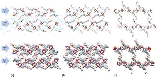 In each of the three structures, the 1D coordination polymer chains pack side-by-side to form 2D sheets. Figure 14 compares the packing of two adjacent chains (each runs left to right in the figure as defined by the blue arrows) in [2{Cu2(μ-OAc)4(2)}·1.25MeOH]n (Figure 14a), [Cu2(μ-OAc)4(3)]n (Figure 14b) and [{Cu2(μ-OAc)4(4)}·0.2CHCl3]n (Figure 14c). At first glance, Figure 14a,b indicate similar packing, but closer inspection reveals a translational shift of chain 2 with respect to chain 1 on going from Figure 14a,b. While the n-butoxy chains are aligned to optimize van der Waals packing interactions (Figure 14a and Figure S17), pairs of n-pentyloxy chains are offset, and a potential interaction is partially interrupted by an acetato methyl group (Figure 14b). The space-filling representation in Figure 14b shows a centrosymmetric embrace between n-pentyloxy and methyl units. With an increase in the length of the alkyloxy tail to n-heptyloxy, the packing of polymer chains in a 2D sheet undergoes a significant change (Figure 14c) with van der Waals interactions between partly extended n-heptyloxy tails being the dominant in-sheet interactions. The cavity visible in Figure 14c is occupied, not by solvent molecules, but by ligands 4 from the next sheet.
