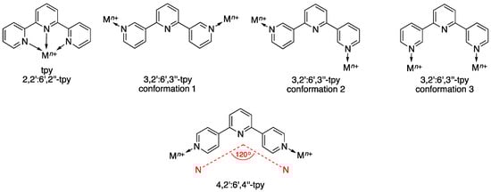 Chelating metal-binding mode of tpy (monotopic ligand) versus ditopic metal-binding modes of 3,2′:6′,3″-tpy and 4,2′:6′,4″-tpy.