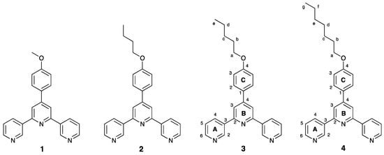 Compounds 3 and 4 were synthesized using Hanan’s [] one-pot synthesis from 3-acetylpyridine and the appropriate 4-alkyloxybenzaldehyde in the presence of base, followed by the addition of aqueous ammonia. After purification, 3 and 4 were isolated as white solids in yields of 23.5 and 28.9%, respectively. Figures S1 and S2 (see Supplementary Materials) show the electrospray mass spectra of 3 and 4, with base peaks at m/z = 396.20 and 424.26, respectively, corresponding to the [M+H]+ ions. The solid-state IR spectra of 3 and 4 are similar (Figures S3 and S4), consistent with 3 and 4 having analogous structures. The 1H and 13C{1H} NMR spectra were assigned using 2D methods. Figure 1 displays a comparison of the 1H NMR spectra of the two compounds with the only significant difference being in the aliphatic region consistent with an n-pentyloxy chain in 3 versus n-heptyloxy chain in 4. The HMQC and HMBC spectra are shown in Figures S5–S8.