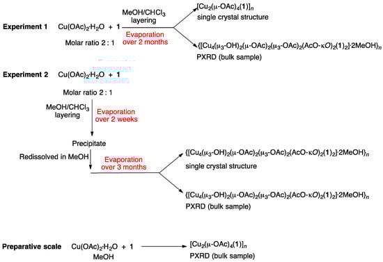 The results indicate that, on a preparative scale, ligand 1 reacts with Cu(OAc)2·H2O to immediately yield the 1D-coordination polymer [Cu2(μ-OAc)4(1)]n. However, when the reaction is carried out under conditions of crystal growth by layering over a period of several months, the incorporation of hydroxido ligands and formation of {Cu4(μ3-OH)2(OAc)6}-clusters becomes dominant. PXRD reveals that the double-stranded coordination polymer {[Cu4(μ3-OH)2(μ-OAc)2(μ3-OAc)2(AcO-κO)2(1)2]·2MeOH}n is the major product in both experiments 1 and 2, and the selection of the single crystal of [Cu2(μ-OAc)4(1)]n was fortuitous.