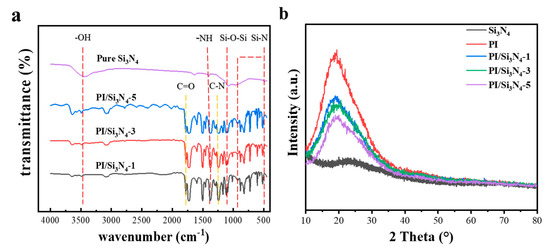 FTIR (a) and XRD (b) spectra of pure Si3N4 nanoparticles and PI/Si3N4 matrix.