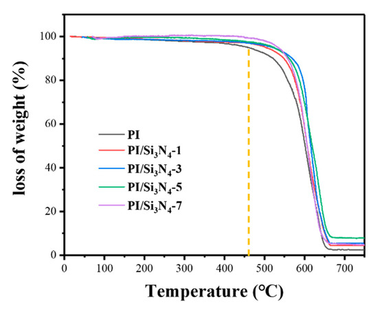 As can be seen from Figure 3 and Table 1, when the temperature is above 550 °C, the polymer begins to degrade rapidly, and the maximum degradation rate is around 600 °C. At the same time, the corresponding heat resistance index of pure PI and PI/Si3N4 composites are 259 °C, 272 °C (1 wt.%), 279 °C (3 wt.%), 279 °C (5 wt.%), 279 °C (7 wt.%), respectively. The results show that the thermal stability of the composites is improved, which is due to the high thermal conductivity of silicon nitride.