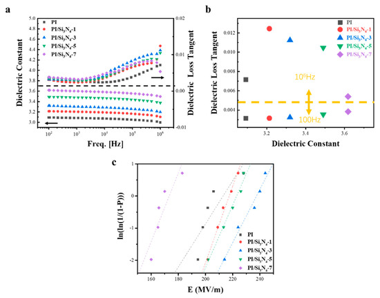 The mass fraction of Si3N4 fillers affecting (a) the dielectric constant (ε) and dielectric loss tangent (tanδ) values at a different frequency; (b) between dielectric constant (ε) and dielectric loss tangent (tanδ) values at 100 and 106 Hz of the PI/Si3N4 composites; and (c) Weibull-distribution plot of breakdown strength for PI/Si3N4 composites.