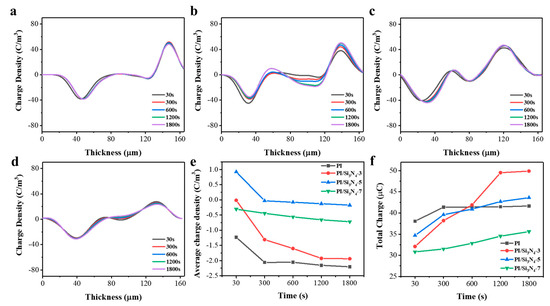 Space charge distribution in the pure PI (a), the 3 wt.% PI/Si3N4 (b), the 5 wt.% PI/Si3N4 (c) and the 7 wt.% PI/Si3N4 (d) nanocomposite films, and the curves of the average charge density of these (e) and the total charge quantity of these (f).