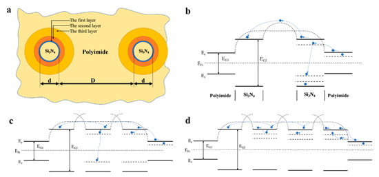 Schematic model of multi-core (a) and energy band structure for PI/Si3N4 composite films in different contents: 3 wt.% (b), 5 wt.% (c), 7 wt.% (d).