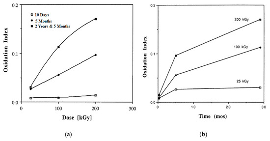The change in oxidation index with (a) radiation dose; and (b) aging time. Reprinted with permission from [60].