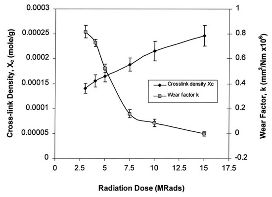 Delamination is the catastrophic type of wear in UHMWPE bearing components [3,86]. The diffusion of free radicals out to polymer matrix or into the polymer as a result of irradiation can lead to the development of a subsurface oxidized band. This subsurface oxidation region can lead to delamination and in many cases, failure occurs from subsurface crack initiation and propagation [4]. Bell [86] investigation on retrieved total knee implants has shown that oxidation of UHMWPE can be influenced by stresses induced during everyday activities or by post-irradiation associated with the subsurface band. This study showed that the delamination occurred only in the presence of the subsurface oxidized band and propagated through this band. In wear test, an increase in oxidation produced increased surface wear without delamination. Similarly, in fatigue and tensile tests, there was a reduction in the fatigue resistance and in ultimate tensile strength of oxidized UHMWPE specimens. Oxidation increased the fatigue crack growth rate. It was also observed that the resistance to oxidation was different in different grades of UHMWPE. The wear mechanism of UHMWPE can be better understood by treating it anisotropic material [2,89]. The strength of UHMWPE depends on the direction in which load is applied. So a wear mechanism can be better assessed by multidimensional wear tests [90]. Wang [91] performed hip-joint simulator experiments on both linear and crosslinked UHMWPE to investigate the effect of molecular chain orientation on the wear surfaces and within wear debris. The UHMWPE specimens sterilized by ethylene oxide gas in the air and by gamma irradiation in nitrogen were used for tests. Crosslinking was not achieved by ethylene oxide gas sterilization. Results obtained from the hip simulator test indicated that the wear resistance of UHMWPE can be significantly improved by radiation-induced cross-linking. The strength of bearing surfaces in multidirectional sliding experiments was lower than the bearing surfaces in uniaxial tensile tests. The phenomenon of strain-softening in UHMWPE bearing surfaces is also due to the structural anisotropy. This study recommends maintaining the homogenous and isotropic molecular structure of UHMWPE bearing surfaces for achieving high résistance to strain to harden. A large number of wear models have been developed to explain the morphology of wear debris [84,92,93]. Wang [94] proposed a theoretical model for UHMWPE based on the concept of frictional work under multi-directional lubricated sliding conditions. Based on the theory, the wear volume loss per unit load and sliding distance was related to the cross-link density, COF, and the maximum shear angle. The COF and wear volume rate of UHMWPE were decreased with increasing the cup/head clearance. The linear increase in wear volume loss was observed with an increased COF. The wear rate was shown to increase linearly with increasing the COF. The wear rate can be decreased by irradiation as indicated by results in hip simulator. The effect of radiation dose on crosslinking and wear factor is shown in Figure 5. The linear increase in wear rate was observed with increasing the molecular weight into crosslinks.