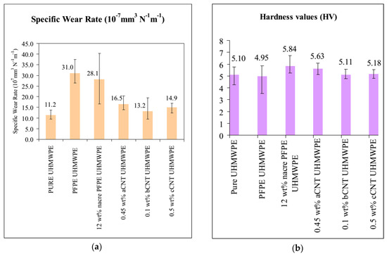 (a) Wear rate for different UHMWPE composites (b) The Vickers hardness values for different UHMWPE composites. Reprinted with permission from [126].